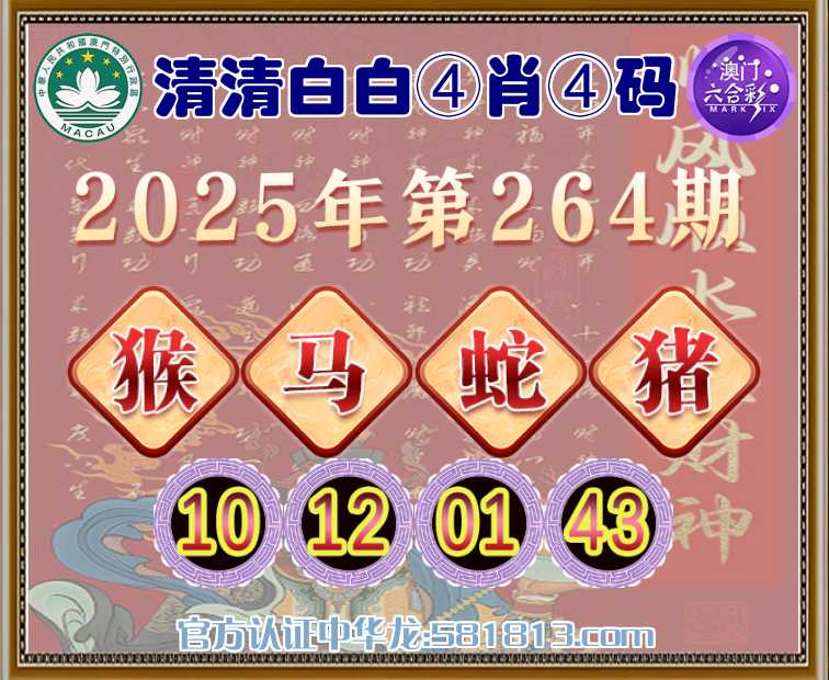 264期:【清清白白】 🍗④肖④码🍗【猴马蛇猪】【10.12.01.43】开:猪43准