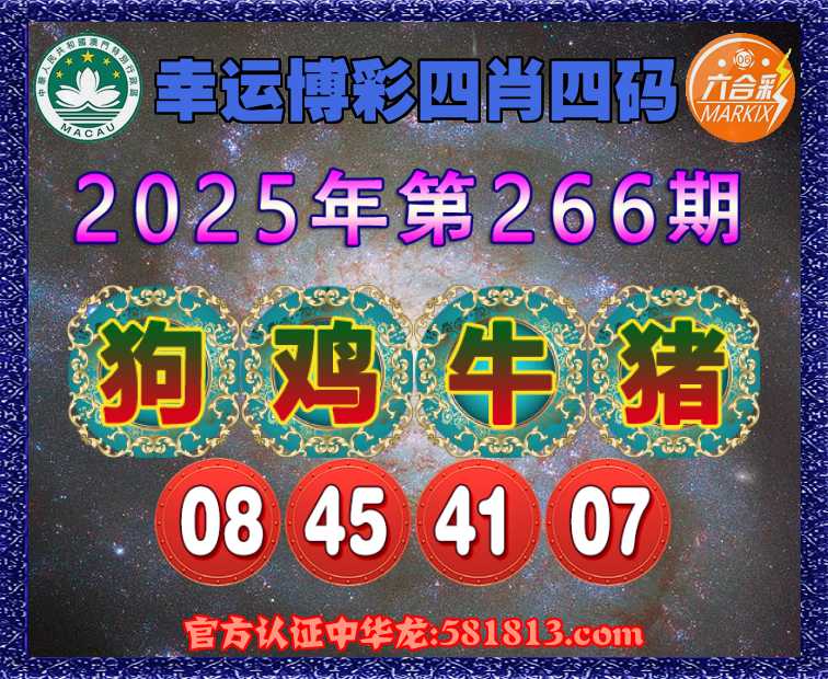266期:〖幸运博彩〗 🏇四肖四码🏇【狗鸡牛猪】【08.45.41.07】开:牛41准