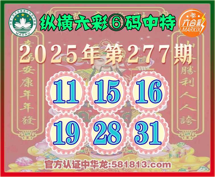 277期:《纵横六彩》 🩴⑥码中特🩴【11.15.16.19.28.31】开:16准
