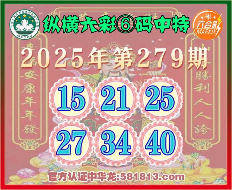 279期:《纵横六彩》 🩴⑥码中特🩴【15.21.25.27.34.40】开:27准